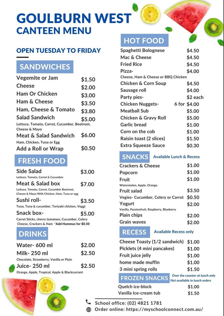 Our school lunch orders are kindly provided to us by Goulburn West Public School from Tuesday to Friday each week.